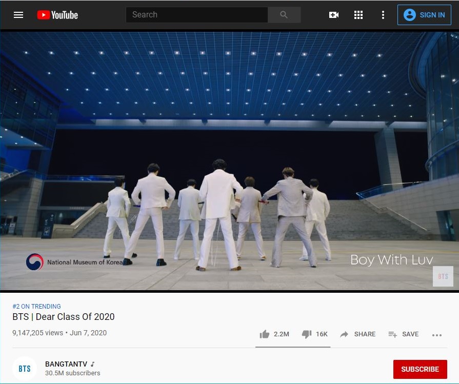 BTS also performed a list of songs at the National Museum of Korea. BTS’s performance of “Boy with Luv”, “Spring Day”, and “Mikrokosmos” was filled with emotional depth and grace. BTS also performed their choreographed high-energy dance routine. This performance is #2 on YouTube Trending.