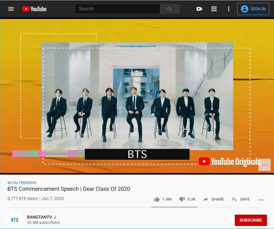 BTS’s commencement speech is #4 on YouTube Trending. BTS spoke inspiring words of hope and comfort while congratulating the graduates. RM shared his story about his middle school graduation while talking about the feeling of being yourself. Jungkook shared his story and mentioned that he had Jajangmyeon with the other members of the group after his graduation ceremony. Jungkook also talked about the power of having faith in himself, his members, and the world. Also, Jin shared his experience of graduating while sharing his affirmations about conquering doubt.